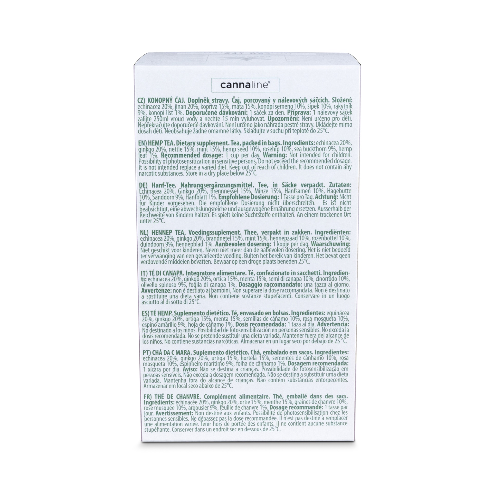 Ingredientes: Echinacea 20%, ginkgo 20%, urtiga 15%, hortelã 15%, semente de cânhamo 10%, rosa mosqueta 10%, espinheiro marítimo 9%, folha de cânhamo 1%. Vegan, sem cor artificial, sem sabor artificial.